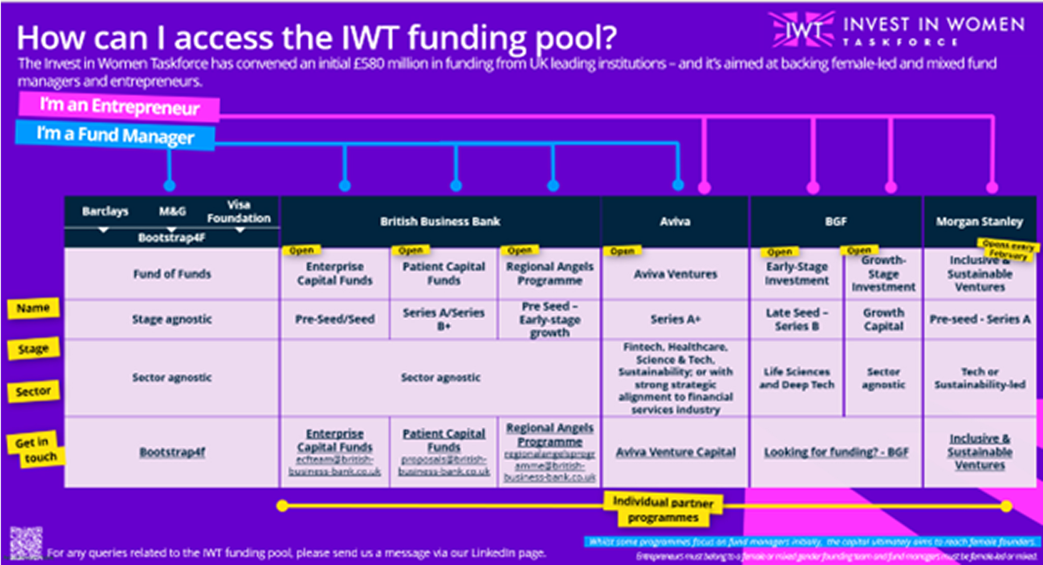 Our Taskforce has convened an initial £580 million in funding from seven leading investors: Barclays, M&G, The British Business Bank, Morgan Stanley, BGF, The Visa Foundation and Aviva. Each of these partners have committed new funding and there are two ways this capital will reach female investors and founders:
